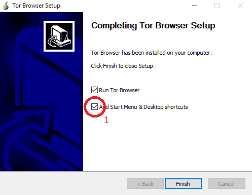 After you’ve downloaded the Tor Browser installer, double click on the installer to start the installation process. Choose your language and select where you want to save the bundle to then click “OK”. At least 181 MB free space must be available in the location you select. If you want to leave the bundle on the computer, saving it to the Desktop is a good choice. If you want to move it to a different computer or limit the traces you leave behind, save it to a USB disk. Once finished, make sure that you check the box labeled “Add Start Menu & Desktop shortcuts” (1) for an easy way to start the browser.